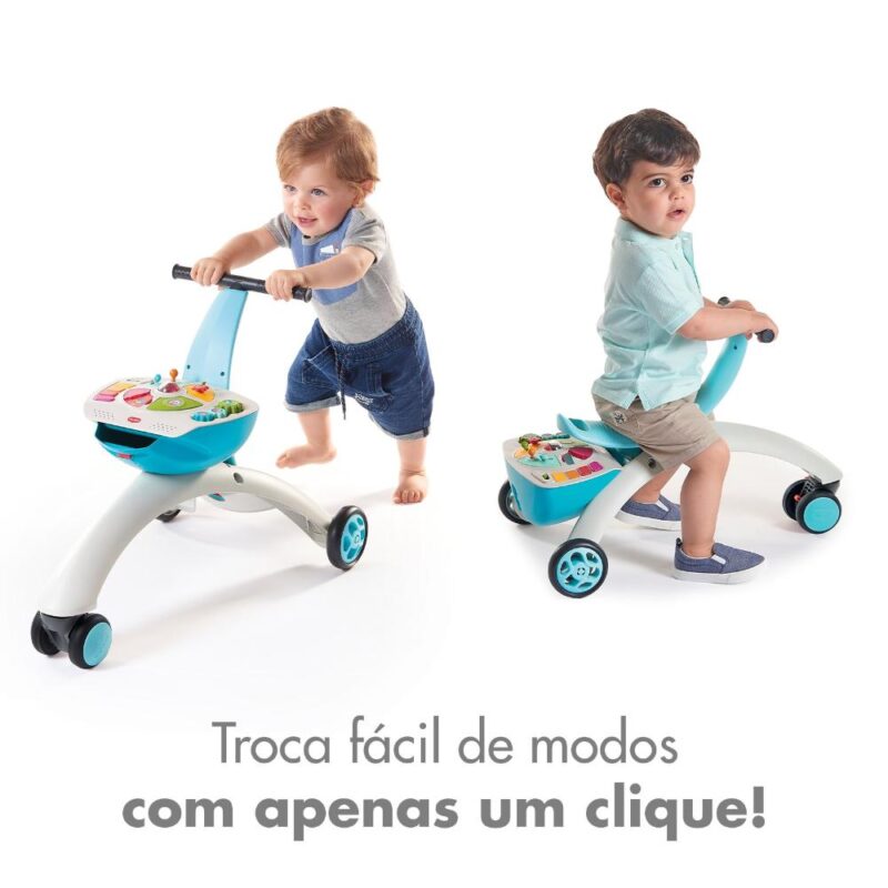 O Goal Walker da Cosco acompanha o desenvolvimento do bebê com 4 funções em um só produto: andador, balanço, pula-pula e centro de atividades. Com assento giratório 360°, bandejas com brinquedos sonoros e ajuste de altura, garante diversão com segurança.