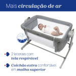 Com 11 níveis de altura ajustáveis e pés dobráveis, o Next2Me Magic Evo se adapta à maioria das camas, enquanto as duas laterais em malha e o colchão 3D respirável asseguram ventilação constante e conforto extra. Para maior praticidade, conta com 4 rodas giratórias com freios, permitindo movimentar o berço pela casa sem esforço.