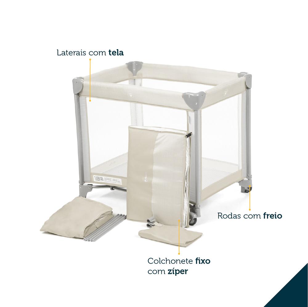 Conteúdo da embalagem: 1 berço, 1 bolso lateral, 1 bolsa para transporte, 1 mosquiteiro e 1 manual de instruções