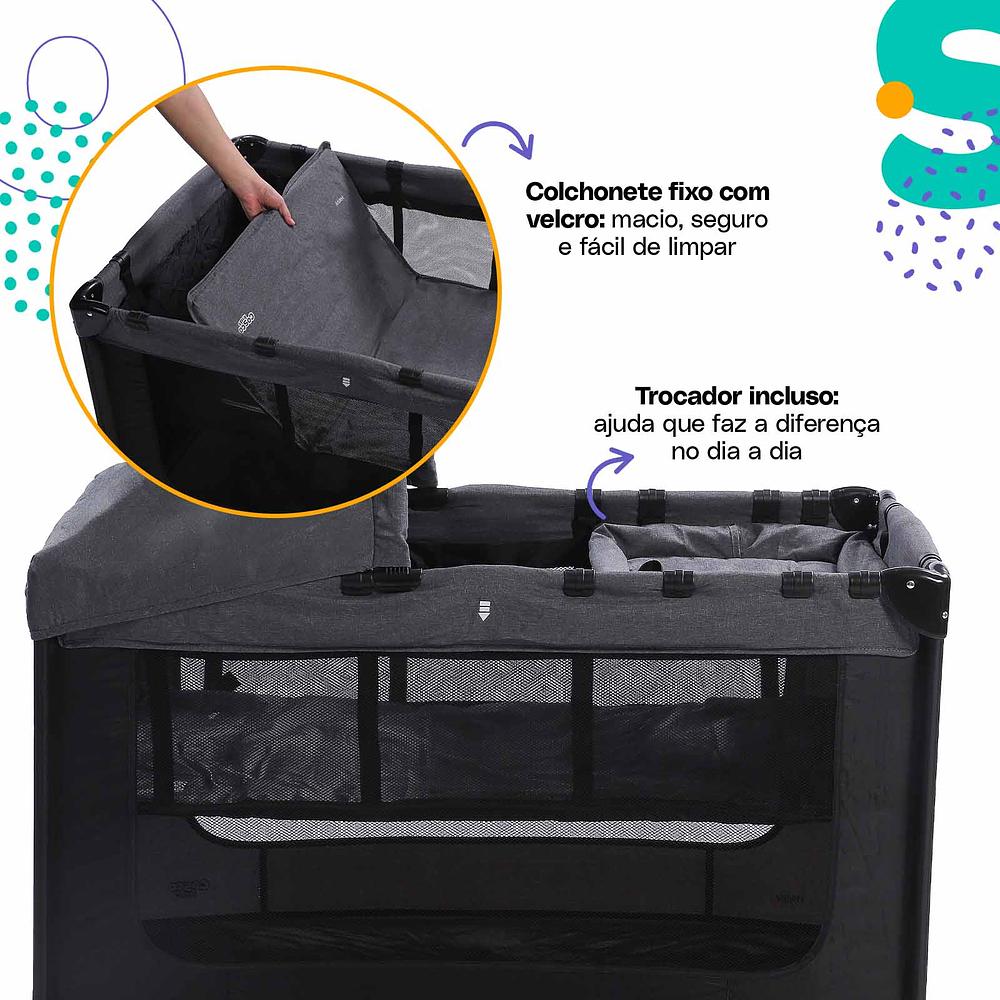 O Happy é completo e super prático: ele monta e desmonta com poucos cliques e vem com uma bolsa de transporte, o que facilita levar para casa da vovó ou para aquela viagem especial. Ele pode ser usado como berço ou cercadinho, garantindo versatilidade no dia a dia. Um espaço seguro e muito divertido para seu bebê poder brincar, tirar uma soneca e ficar feliz em qualquer lugar!