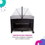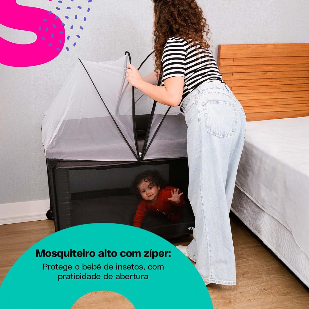 Com 2 alturas, cresce junto com o pequeno. Tem mosquiteiro super prático com zíper e é facinho de transportar e montar.