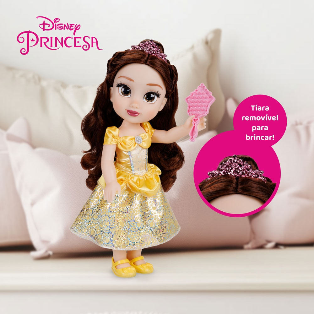 Compartilhe aventuras eternas e cotidianas com uma amiga querida, com a linda Boneca Disney Princess Bela! Vestida em seu icônico vestido amarelo e com belos detalhes de glitter, Belle é mais bonita que uma rosa e está pronta para se juntar a você em qualquer brincadeira! Essa linda boneca possui olhos brilhantes de glitter, mede 38cm de altura e acompanha uma tiara e um lindo par de sapatos.