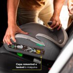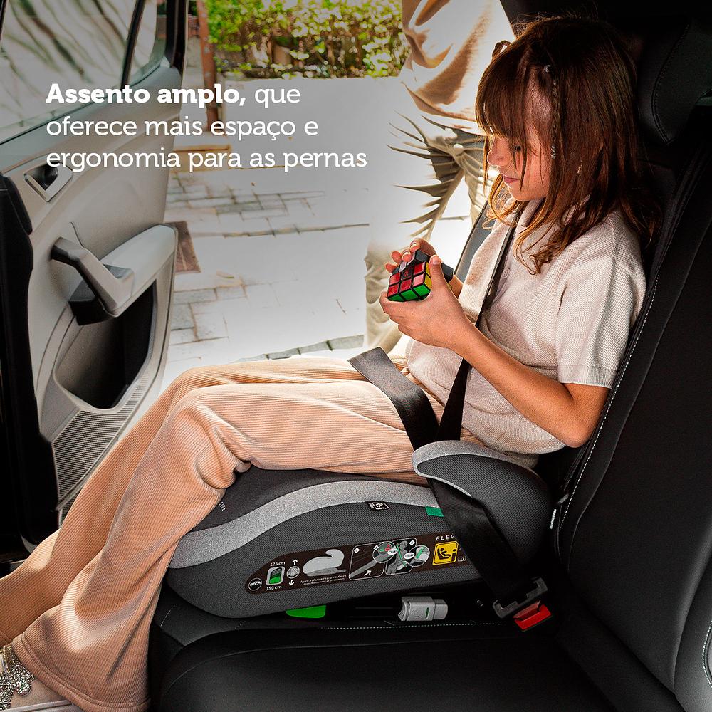 Com ajuste manual de altura, assento amplo, Isofix e apoio de braço, o Booster Elev i-Size garante estabilidade e posicionamento seguro do cinto na fase em que a criança já saiu da cadeirinha. Quando a criança atinge os 100 cm ou 4 anos aproximadamente e deixa a cadeirinha, o assento de elevação passa a ser essencial no carro. É ele que garante que o cinto seja usado do jeito certo e ofereça a proteção que essa nova fase exige.