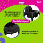 A Cook acompanha a criança desde a introdução alimentar até quando já está comendo sozinha. Ela ajuda o pequeno a ficar pertinho da mesa e do restante da família, contribuindo para o seu desenvolvimento. E olha só: a bandeja ainda pode ser guardada com facilidade na parte de trás!