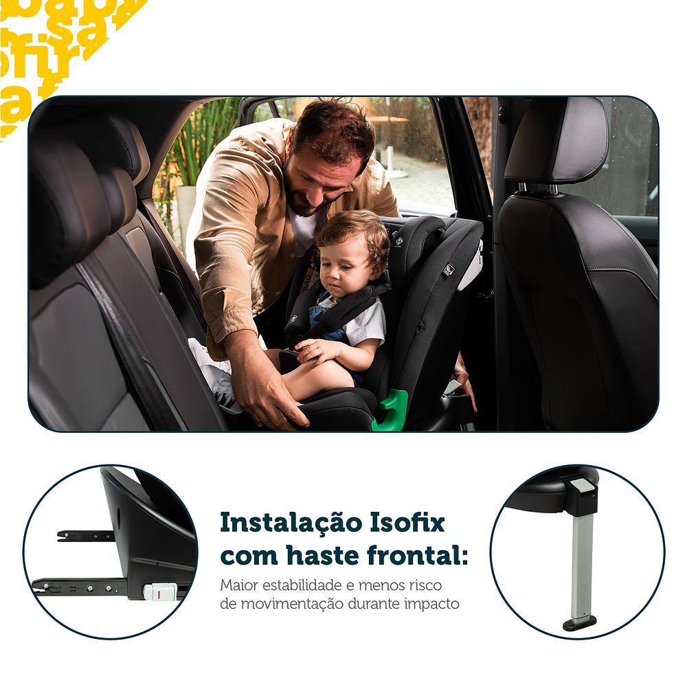-Instalação com Isofix e haste frontal, que fixa a cadeira com mais estabilidade e reduz deslocamentos em caso de impacto.