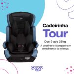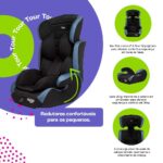 A cadeirinha Tour acompanha a criança aproximadamente desde o primeiro aniversário até os 10 anos de idade. Feita pra durar, ela vai se adaptando ao crescimento da criança para dar conforto em todas as fases.