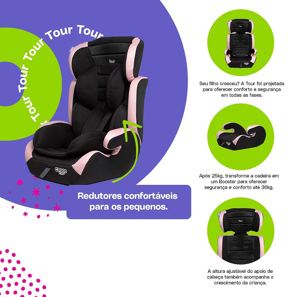 A cadeirinha Tour acompanha a criança aproximadamente desde o primeiro aniversário até os 10 anos de idade. Feita pra durar, ela vai se adaptando ao crescimento da criança para dar conforto em todas as fases.