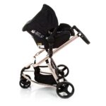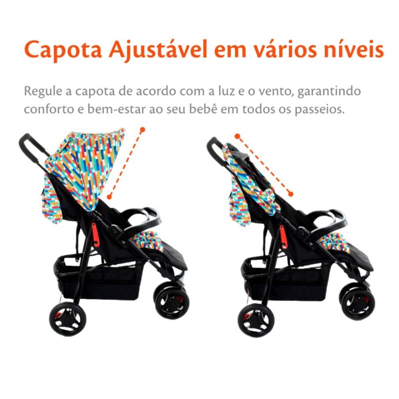 O carrinho possui estrutura leve em alumínio, com acabamento cromado, moderno e atual, revestimento especial na manopla e barra frontal, capota ajustável, ampla, com proteção solar UV50+ e visor, assento reversível, pode ser usado virado para os pais ou para o mundo, acompanhando o crescimento do bebê, facilmente converte-se em assento de passeio, reclinável em 4 posições, encosto ajustável em 2 posições, o difencial do apoio dos pés, emborrachado, ajustável em 7 posições, que proporciona um maior conforto para os maiorzinhos e praticidade para os pais, cinto de 5 pontos com ajuste de largura e 3 posições de altura, manopla com 5 posições de altura, cesto espaçoso, rodas traseiras grandes, amortecedores, freio centralizado, em um único ponto, com indicador de travamento, controle de giro 360° nas rodas dianteiras, muito mais conforto para o bebê e para dirigir. Fechamento rápido, que pode ser feito com ou sem o assento.