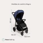 O Magno foi pensado para acompanhar o seu bebê desde o nascimento até os 22 kg, oferecendo conforto e estabilidade em cada passeio. Suas rodas grandes, com 25 cm de diâmetro, têm amortecedores nas quatro pontas, o que ajuda a manter o carrinho firme e suave mesmo em terrenos irregulares.