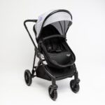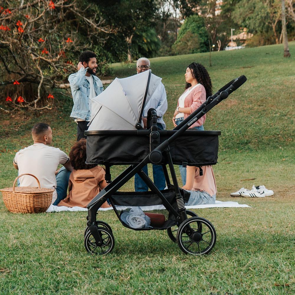 E quando ele começa a crescer, é só ajustar pro modo passeio, tudo com conforto de sobra e jeitinho prático que encaixa na rotina das famílias. A estrutura é robusta, as rodas têm amortecedores para andar em terrenos irregulares, e a manopla se ajusta na altura de quem estiver empurrando (pode ser a mamãe, o papai ou até a vovó!).