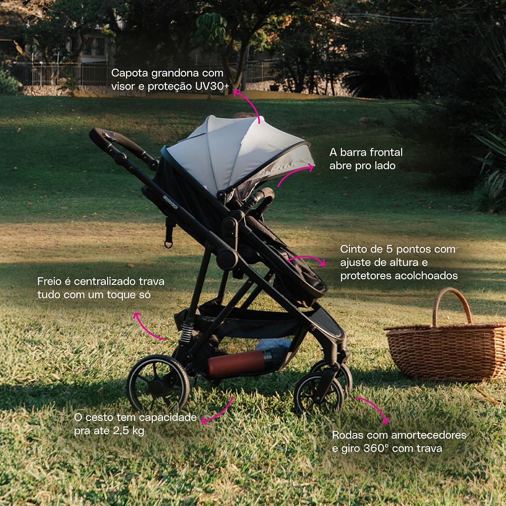 -assento do carrinho vira moisés rapidinho, ideal pra aquele cochilo bom no meio do passeio, e é reversível, deixando o bebê de olho em quem cuida ou descobrindo o mundo lá fora.