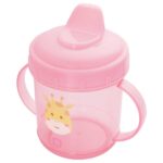 Copo com alça dupla para facilitar a pega e bico anatômico feito para auxiliar na transição da mamadeira para o copo.
