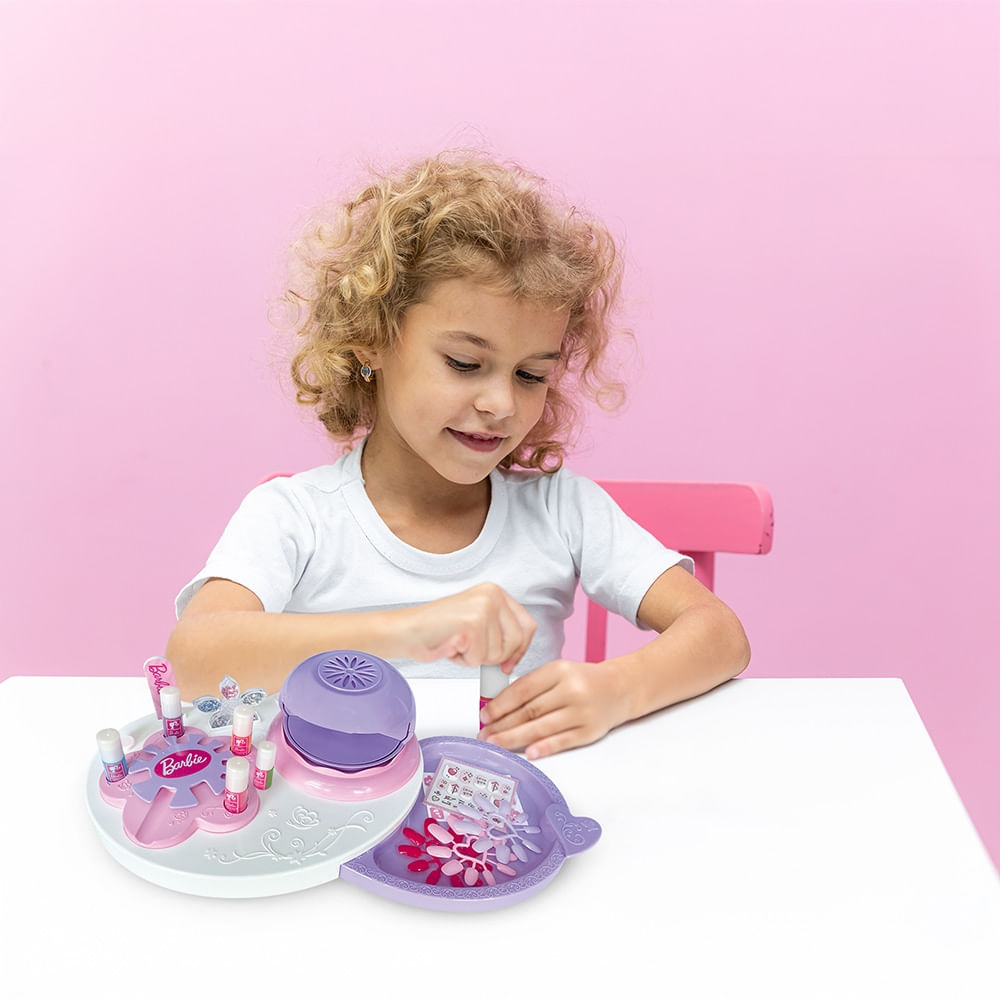 Contém 1 Secador de Unhas, 6 esmaltes dermatologicamente aprovados, juntamente com adesivos, unhas postiças, strass e muito mais para deixar suas unhas tão estilosas quanto as da Barbie!