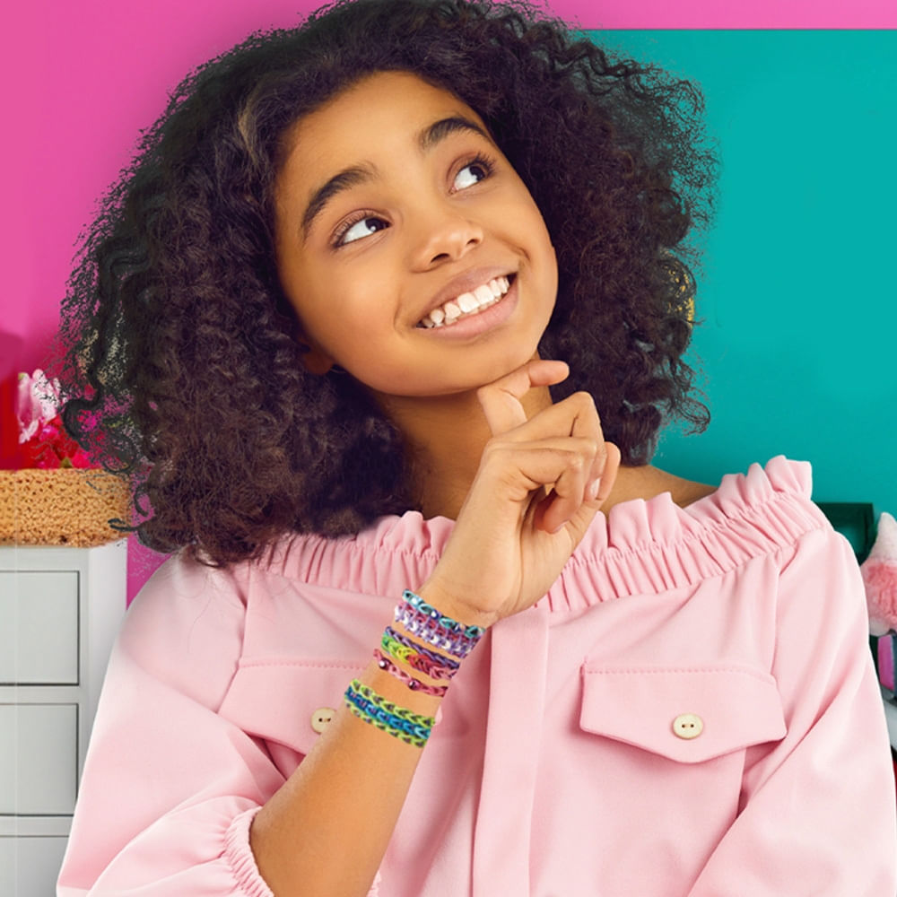 Com 42 pinos numerados no tear, você consegue criar designs personalizados e diferenciados para suas pulseiras. A fábrica vem com 1.000 elásticos em 5 cores diferentes, além de 15 pingentes superestilosos.