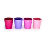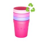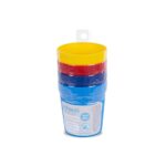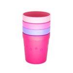 É totalmente livre de materiais tóxicos, sem BPA (Bisfenol-A e Ftalatos) e é amigável com o meio ambiente, pois pode ser reciclado. São feitos em Polipropileno (PP) e podem ir ao micro-ondas, congelador e até na lava-louças. Também são empilháveis para o armazenamento, trazendo a facilidade que os pais precisam para o seu dia a dia. O kit é composto por 4 copos de 200 ml cada, em cores variadas.