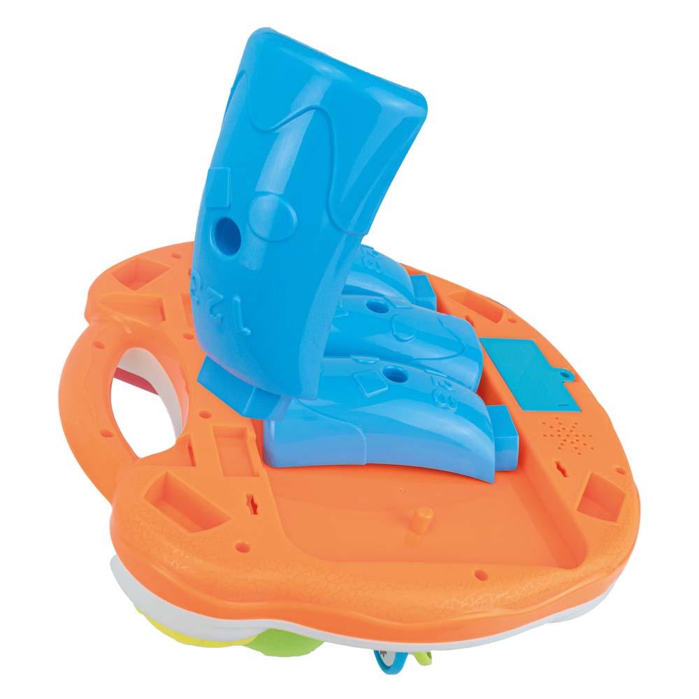 É preciso colocar pilhas 2AA, encaixar os pés na mesa que vem separados na embalagem ou prender a mesma em alguma superfície com as tiras que também acompanham a embalagem antes de deixar a criança brincar. O brinquedo possui botão liga e desliga. Espelho, luzes, efeitos musicais, articulações e botões divertidos.
