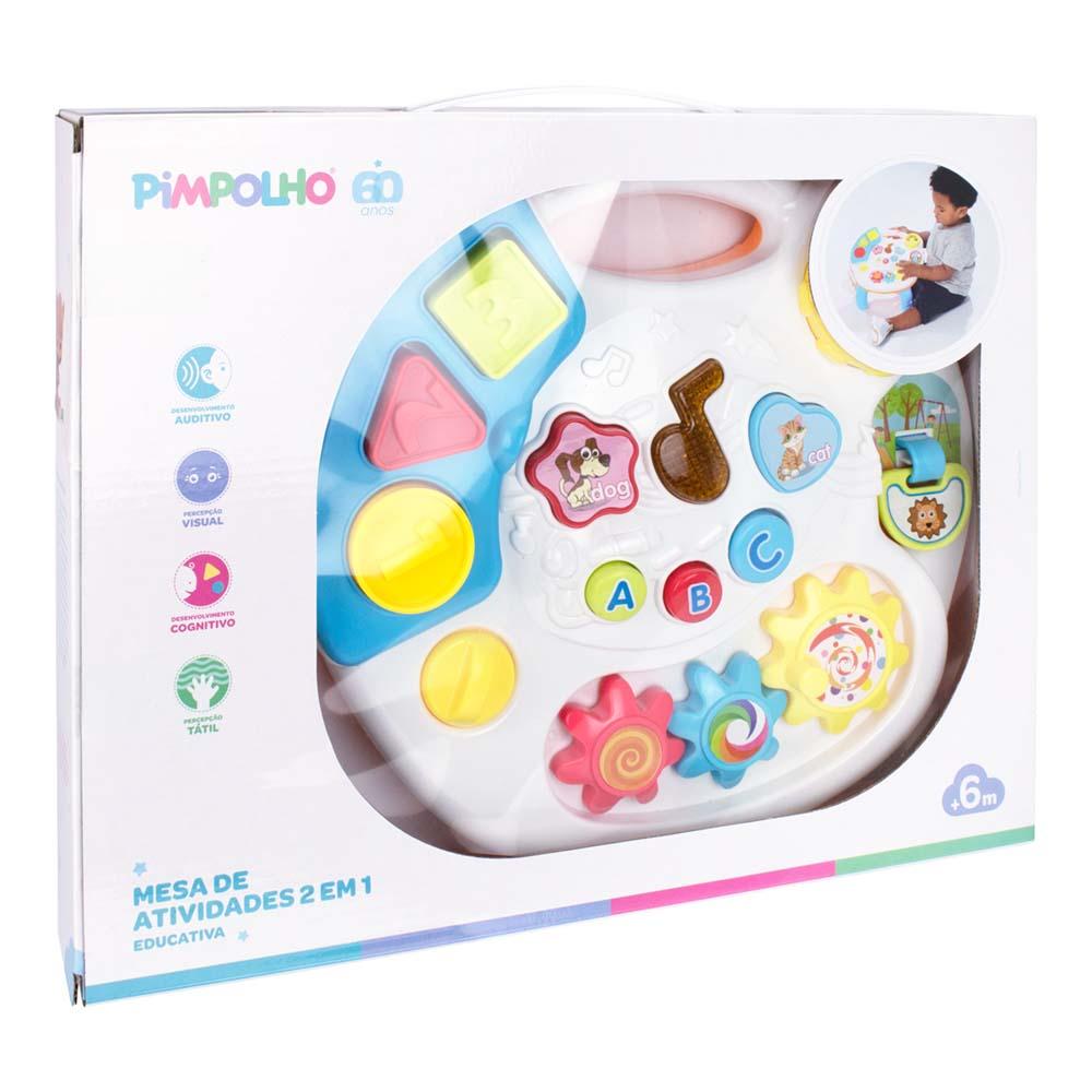 A mesa de atividades educacional 2em1 da Pimpolho brinca e aprende possui luzes e música, inclui alfabeto. números e engranagens com partes luminosas. Possui regulagem de volume e botão liga/desliga. Os pés são destacáveis para facilitar o armazenamento, também possui tiras para ser fixado no berço ou carrinho por exemplo. PILHAS 2AA. Proporciona aprendizado com músicas e atividades lúdicas. Melhora a capacidade de desempenho das criança; Desenvolve a inteligência das crianças; Apura o interesse e a confiança das crianças; Aumenta o senso de mundo; Aprimora a mente criativa; Melhora as habilidades de movimento.