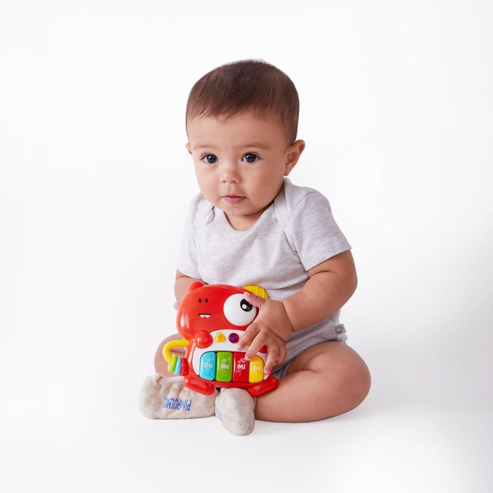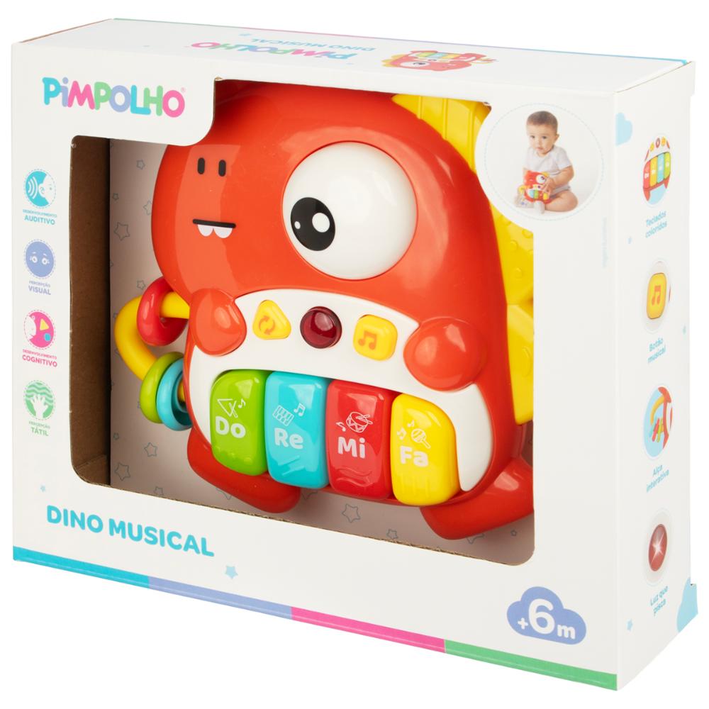 O DINO MUSICAL da Pimpolho possui 4 teclas coloridas, laterais com interação e luzes que acendem. Auxilia no crescimento da criança, estimula e aprimora as habilidades sensoriais, desenvolvendo a percepção auditiva, visual, a criatividade, a concentração, a coordenação motora e a imaginação. PILHAS:3AAA. Botão liga e desliga.